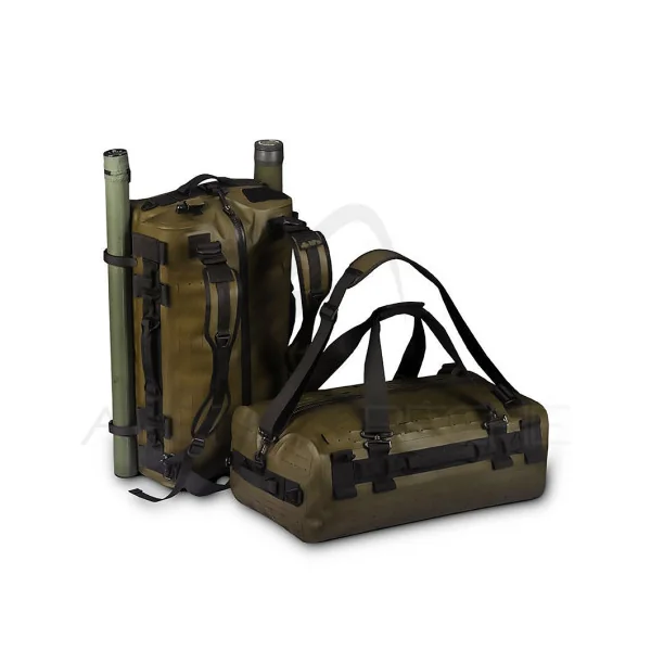Sac hybride entre un duffle bag (polochon) et un sac à dos grâce à son système de portage ergonomique et sa modularité : bretelles escamotables, poignées de portage amovibles et bandoulière pouvant être positionnées sur de multiples points d’accroches. Adaptez le à vos besoins. Conçu à l’origine pour les forces militaires spéciales ce sac est 100% étanche (IP68) grâce au zip étanche TIZIP MASTERSEAL #10 et gonflables grâce à une pipette pour rester en surface lorsque nécessaire (pour éviter la perte de matériel sensible ou servir de bouée). La fonction gonflage permet de disposer d’un sac particulièrement confortable lorsqu’il est porté sur le dos, en offrant rigidité et amorti sans l’adjonction d’une structure rigide. la construction est réalisée à partir de tissu nylon 840D enduit PU double