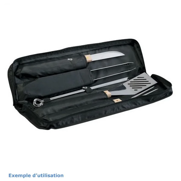 Vous aurez ainsi une sacoche complète avec un couteau, une pince, six brochettes, une spatule et une fourchette.