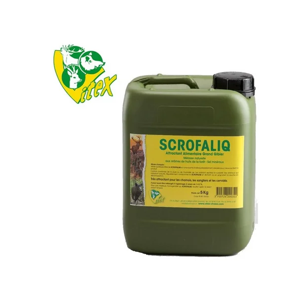 SCROFALIQ VITEX EN JERRICAN DE 5KG :Caractéristiques :-Attractant alimentaire grand gibier y compris gibier de montagne.-A base de mélasse aromatisée aux fruits de la forêt, et enrichie en sels minéraux, ce produit est aussi particulièrement appétant pour les chamois.-C’est le premier attractant alimentaire efficace sur le grand gibier de montagne.-Le scrofaliq les fidélisera aux endroits recherchés où ils viendront régulièrement lécher et grignoter la vieille souche en décomposition ou le bois mort sur lequel il a été versé.-Fabriqué en France. -Jerrican de 5Kg.-Pour de grosses quantités merci de nous contacter !*DANGEREUX ! Respecter les précautions demploi.