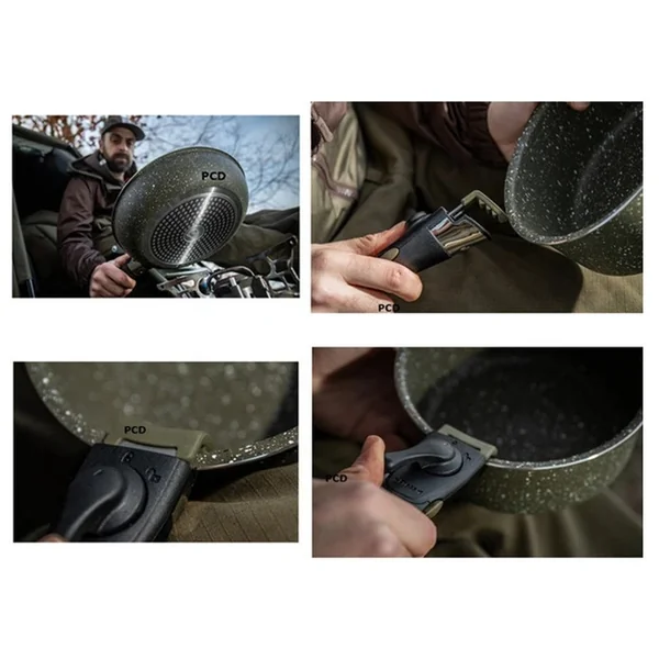 Chaque ensemble comprend une casserole, une poêle à frire et une poignée détachable, compatible avec toutes les casseroles de la gamme, et doté d’un verrou de sécurité à double action pour éviter tout risque de perte accidentelle lors de la manipulation de casseroles chaudes.