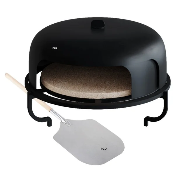 Ce set comprend une plaque en fonte à double face, une pierre à pizza placée sur la plaque en fonte, d’une double cloche en acier dont l’extérieur peut tourner à l’intérieur ainsi que d’une pelle à pizza.