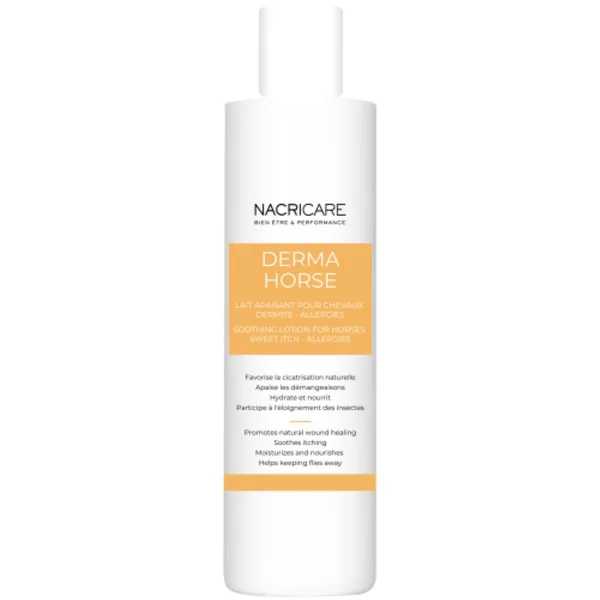 Ce shampoing est particulièrement recommandé pour : les chevaux présentant des démangeaisons dues aux piqûres de culicoïdes (dermite estivale), les réactions cutanées aux piqûres d’insectes (moustiques, taons, mouches…), les réactions cutanées liées à un changement de litière, de paille ou de foin, les démangeaisons générales, quelle qu’en soit la cause. Mode d’emploi Appliquer le shampoing sur le pelage mouillé du cheval. Masser délicatement pour faire mousser et permettre une bonne pénétration des actifs. Laisser agir quelques minutes. Rincer abondamment à l’eau claire. Pour des résultats optimaux, il est conseillé d’utiliser ce shampoing en complément du lait apaisant Derma Horse de Nacricare, notamment en cas de lésions ou de zones particulièrement irritées.