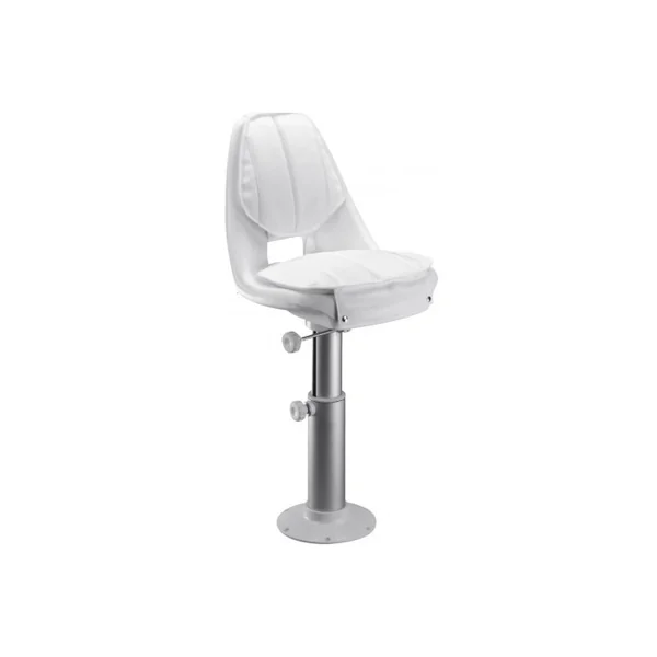 Siege Bateau complet Captain Plastimo fixe sur pivot Polyéthylène antichoc blanc. Coussins skaï blanc. Pied télescopique aluminium anodisé. Base Ø 240 mm, hauteur d’assise 510/730 mm.