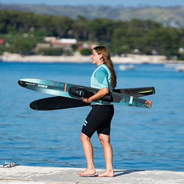 Pour plus de sécurité et de visibilité sur l’eau, les skis sont également dotés d’ailerons lumineux, apportant un repère visuel supplémentaire pendant la pratique.