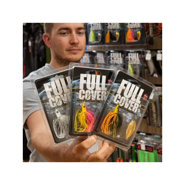 Le Full Cover TI est un spinnerbait développé avec une armature flexible en titane ultra résistante pour optimiser son passage dans le cover et les réussites au ferrage. La forme triangulaire de sa tête lui procure une très bonne stabilité et lui permet de nager sans décrocher à nimporte quelle vitesse de récupération. Il est équipé dune grosse palette « willow » qui se met en mouvement dès que le leurre tombe dans leau. Sa palette pousse énormément deau en émettant dimportantes vibrations et flash lumineux capables dattirer de loin lattention des brochets, black-bass et grosses perches. Son hameçon fort de fer de taille 4/0 permet lassociation de nombreux type de trailer qui viendront parfaitement compléter sa jupe en silicone très fournie.