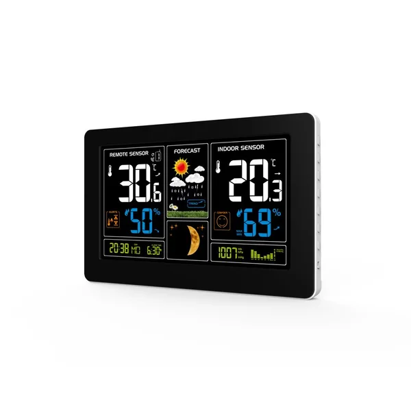 Cette station météo sans fil est équipée d’un capteur extérieur permettant de mesurer les températures, les taux d’humidité, d’obtenir les prévisions, la pression atmosphérique, la phase de la lune…… Elle est équipée d’un port USB permettant la charge de votre Smartphone. Elle permet de mémoriser des données températures et humidité mini/maxi, d’afficher l’heure en format 12h ou 24h, d’afficher le jour de la semaine, de programmer une alarme avec fonction Snooze.