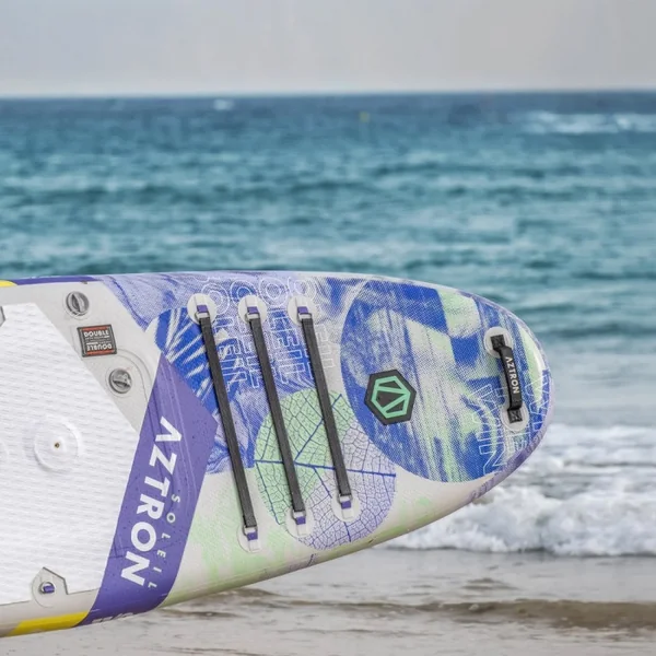 Le soleil est équipé de trois poignées: une centrale , et deux autre situées respectivement à l’avant et à l’arrière. Toutes les poignées Aztron sont dotées d’un revêtement en néoprène et d’un renfort en caoutchouc. Elles offrent de la solidité et permettent à l’utilisateur une bonne prise ainsi qu’un transport confortable.