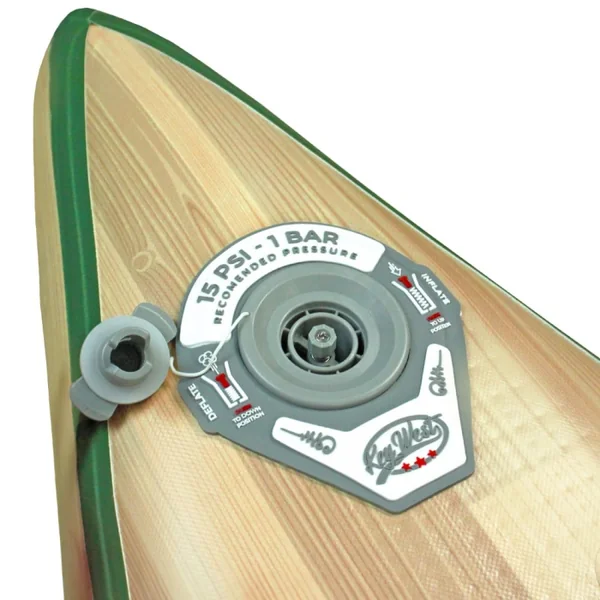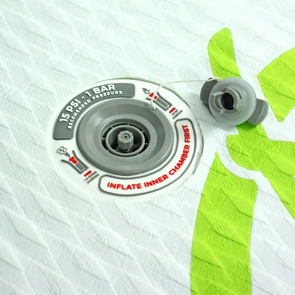 Un schéma présent sur le contour de la valve montre la manière dont il faut utiliser le bouton poussoir pour gonfler ou dégonfler la planche. Il indique également la pression de gonflage maximum préconisée.