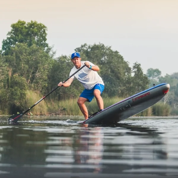 Les planches se composent de deux parties distinctes (mais solidaires l’une de l’autre) qui se gonflent séparément. En plus d’être un élément de sécurité important -la deuxième chambre faisant office de réserve de flottabilité, la présence de deux chambres distinctes a un effet qui peu paraître paradoxal: la rigidité générale s’en trouve encore améliorée par rapport à la gamme Deluxe SC. Cela est dû à la technologie « I Beam Stringers »: deux stringers internes qui bordent la structure de la seconde chambre. Cela ne gêne en rien le pliage du SUP: comme pour la technologie Dropstitch Woven qui structure le cœur des deux chambres, la rigidité n’est effective qu’une fois la planche sous pression.