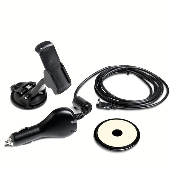 Le kit de navigation auto inclut un support ventouse, un câble d’alimentation allume-cigare et un disque pour tableau de bord.