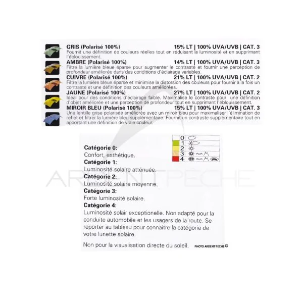 – Le cuivre : teinte qui améliore l’acuité visuelle et la perception des couleurs. Filtre effi cacement les lumières bleues, amélioreles contrastes et donne une meilleure défi nition des couleurs que la couleur ambre. C’est la teinte le plus juste, à utiliserdans toutes les conditions de pêche aussi bien en eaux douces qu’en mer.