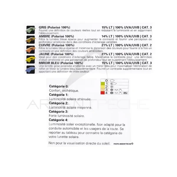 – Le cuivre : teinte qui améliore l’acuité visuelle et la perception des couleurs. Filtre efficacement les lumières bleues, amélioreles contrastes et donne une meilleure définition des couleurs que la couleur ambre. C’est la teinte le plus juste, à utiliserdans toutes les conditions de pêche aussi bien en eaux douces qu’en mer.