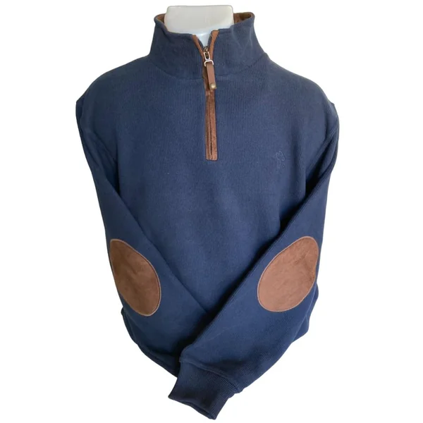 Composition : 50% Coton, 50% Polyester. Col zippé. Coudières en suédine marron. Coloris : marine. Tailles : du S au 4XL.