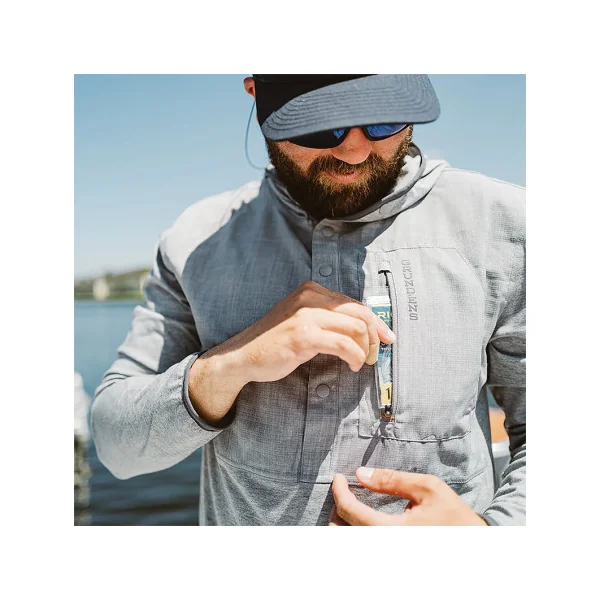 Le Shorebreak Hoodie est un sweat à boutons-pression qui est muni dune capuche ajustable et dune poche zippée à la poitrine. Très agréable à porter, il associe la sensation du coton avec les performances du synthétique pour lutter efficacement contre le vent. La matière principale utilisée dans sa confection lui permet de sécher beaucoup plus vite que la plupart des textiles. Il bénéficie de la technologie anti-odeur Freshguard® et est doté dune protection solaire UPF30. Ses poignets en Lycra sont confortables et ajustés pour un confort optimal en action de pêche.