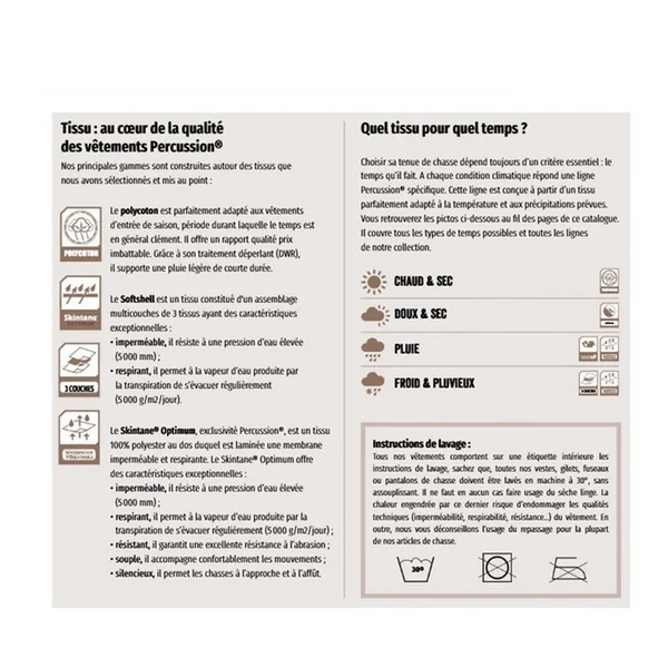 La marque Percussion offre des vêtements fonctionnels, astucieux, solides, résistants, confortables et esthétiques.