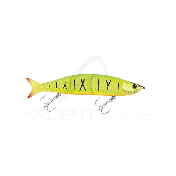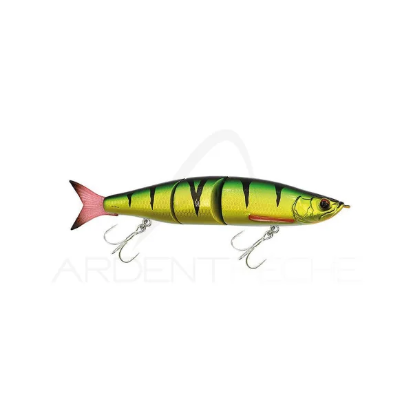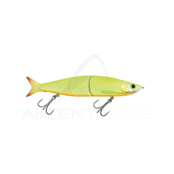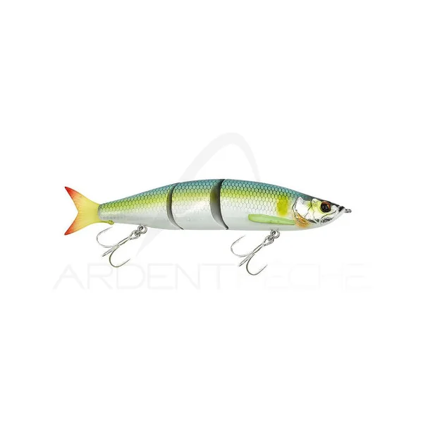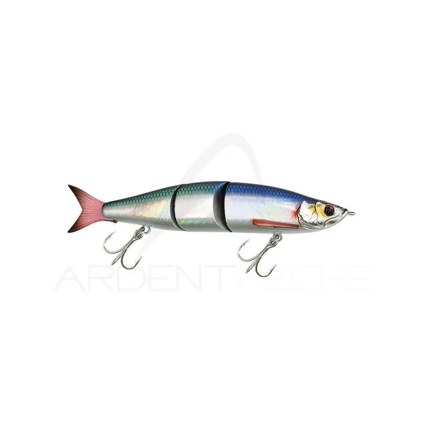 Un swimbait spécialement conçu pour la pêche du Bar. Par une simple récupération linéaire, il va produire une nage en S ample et naturelle. Quand il est jerké, il se désaxe avec de grands écarts latérales tout en vacillant sur lui-même. Et lors des pauses, il descend en papillonant. Ce swimbait est équipé d’un joint pendulaire au niveau de son articulation (système breveté) qui vient bloquer les parties lors du lancer, ce qui lui permet de partir droit pour gagner en distance.