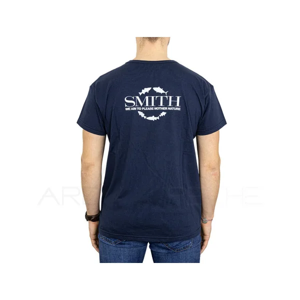 T-shirt bleu marine SMITH avec logos poitrine et dos imprimés en sérigraphie. Réalisé en France, 100% coton bio 140g/m2, conforme à la norme OEKO-TEX, il porte également le logo « Fabriqué en France ». Finition globale de grande qualité.