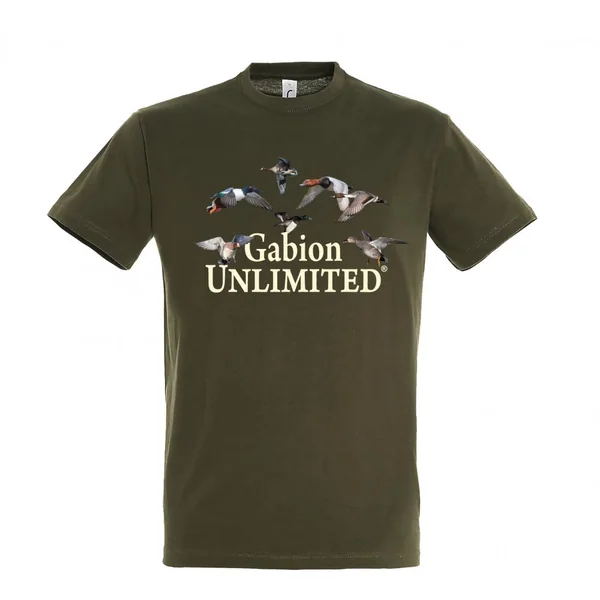 Composition : 100% coton. Canards à la pose et Gabion Unlimited floqués sur le devant. Manches courtes. Coloris : kaki. Tailles : du S au 3XL.