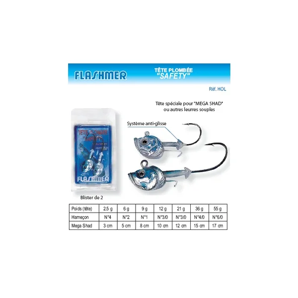 | Têtes Plombées Safety X 2 | Livré sous blister de 2 2.5 gr > N°4 > 3 cm 6 gr > N°2 > 5 cm 9 gr > N°1 > 8 cm 12 gr > N°3/0 > 10 cm 21 gr > N°3/0 > 12 cm 36 gr > N°4/0 > 15 cm 55 gr > N°6/0 > 17 cm |