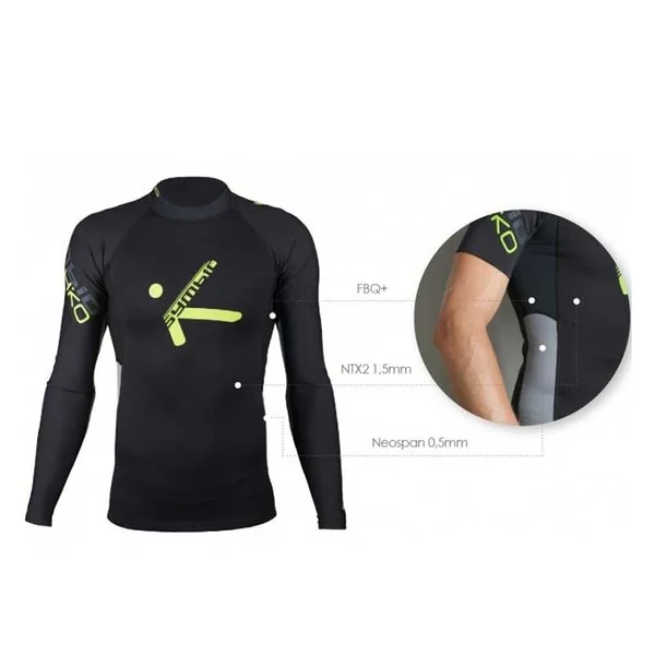 Top néoprène homme manches longues Hiko Symbio Le Symbio combine trois types de matériaux qui sont stratégiquement placés dans des zones pour répondre à leur objectif relatif.