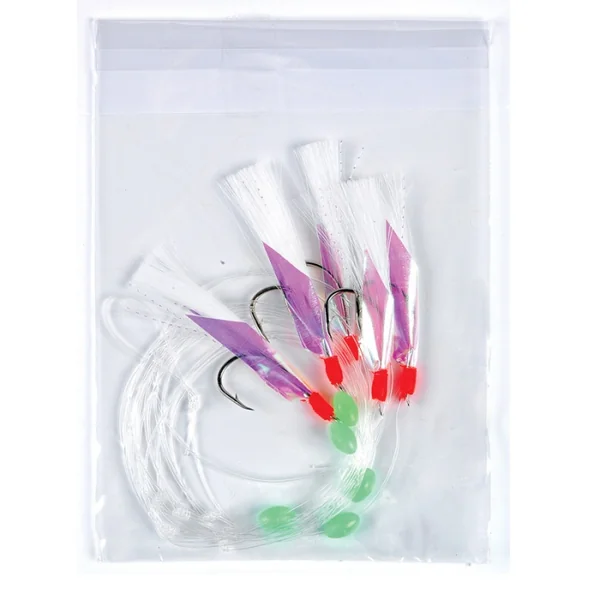 Train de plumes Flashmer Plum A Bar 5 Hameçons N°2/0 Bas de ligne « Plum » à « Bar » Blanche ou Rouge/Jaune